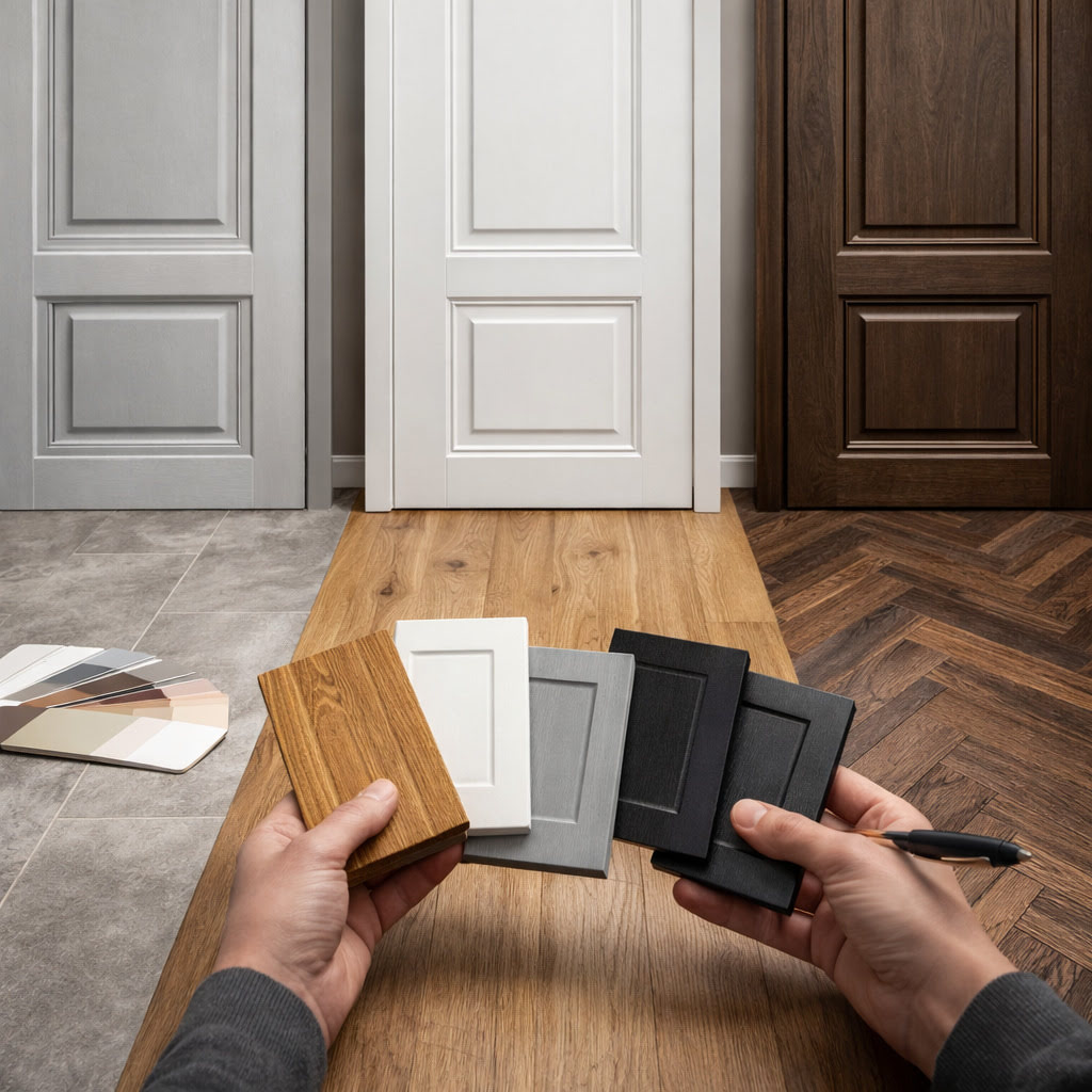 Цвет двери лучше подбирать с учетом напольного покрытия, чтобы интерьер выглядел цельным и гармоничным.
