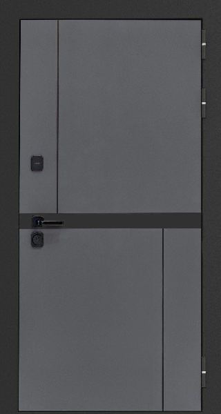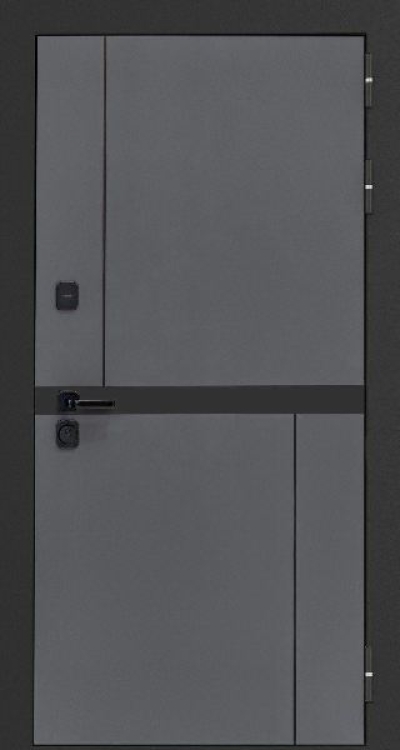 Внешняя отделка: МДФ панель 10 мм, цвет VELLUTO OSCURO + патина черная по фрезеровке, вставка под фурнитуру из металла. Металлические наличники шириной 100 мм.